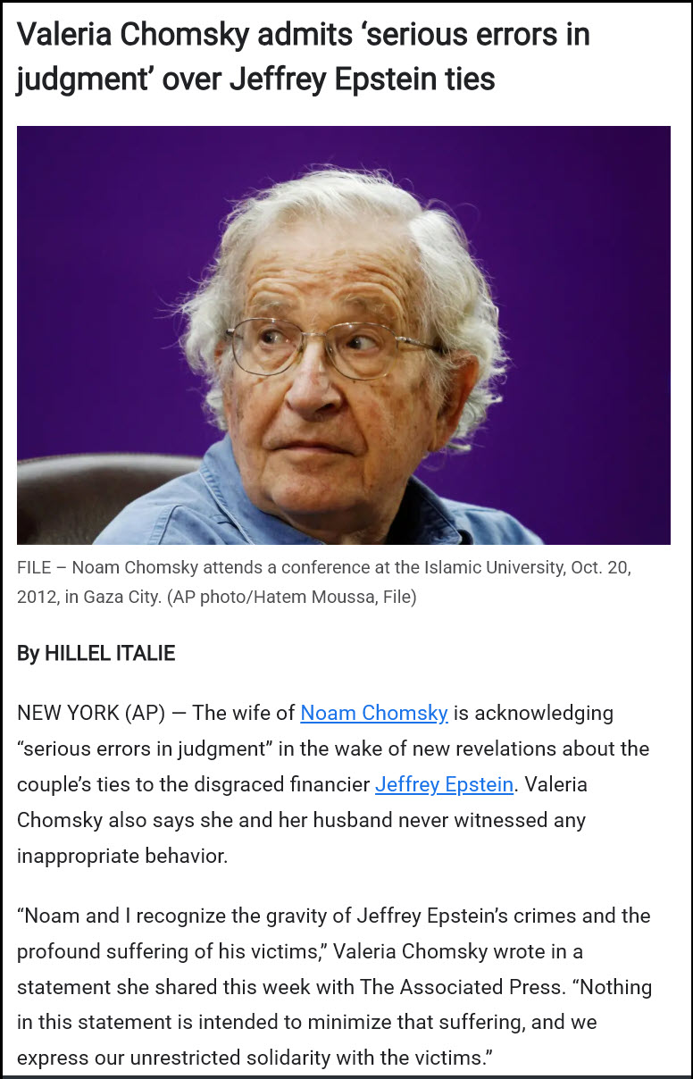 Had it not been for Noam Chomsky’s impeccable reputation, his spouse’s comments regarding her husband’s name appearing in the Epstein files may not have carried significant weight. Epstein was aware of this and exploited it to maintain control over elite, wealthy individuals he came into contact with during social events.