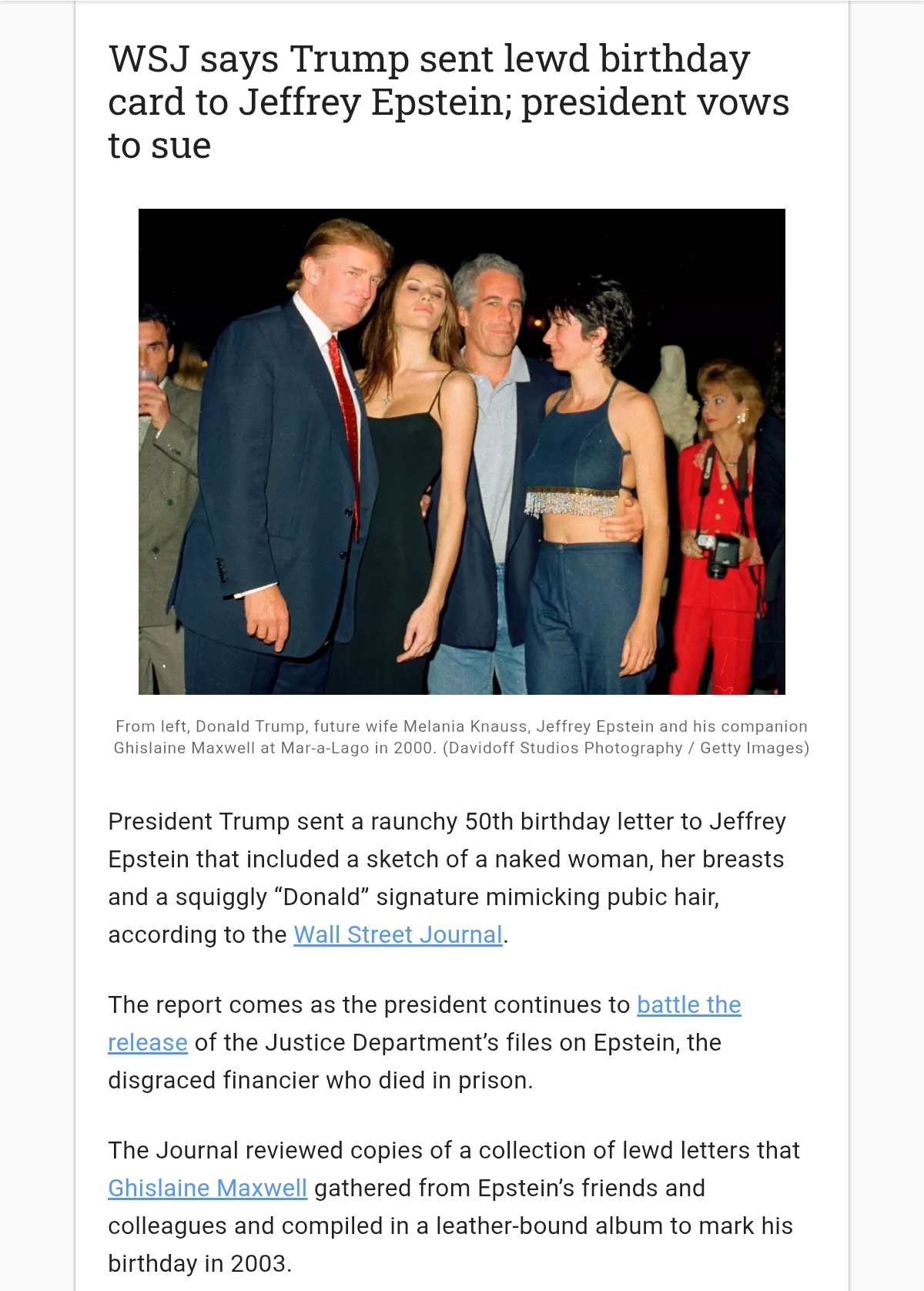 WSJ says Trump sent lewd birthday card to Jeffrey Epstein